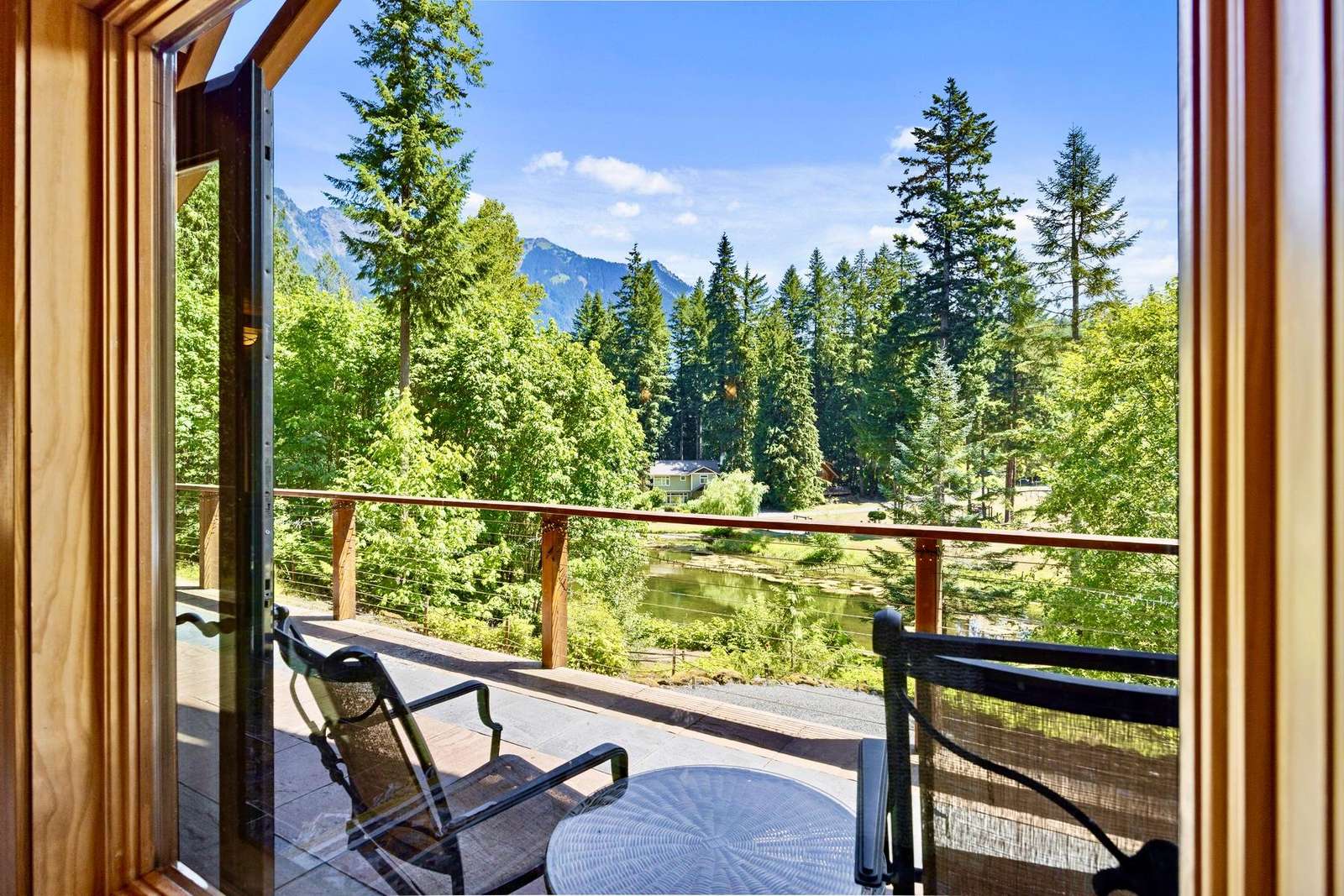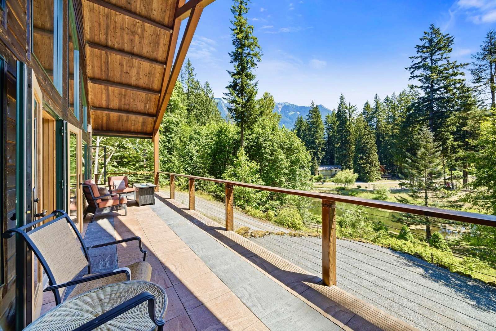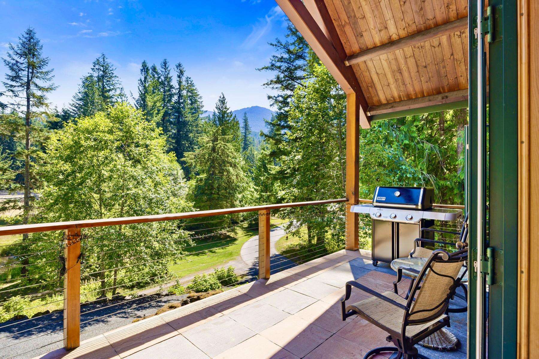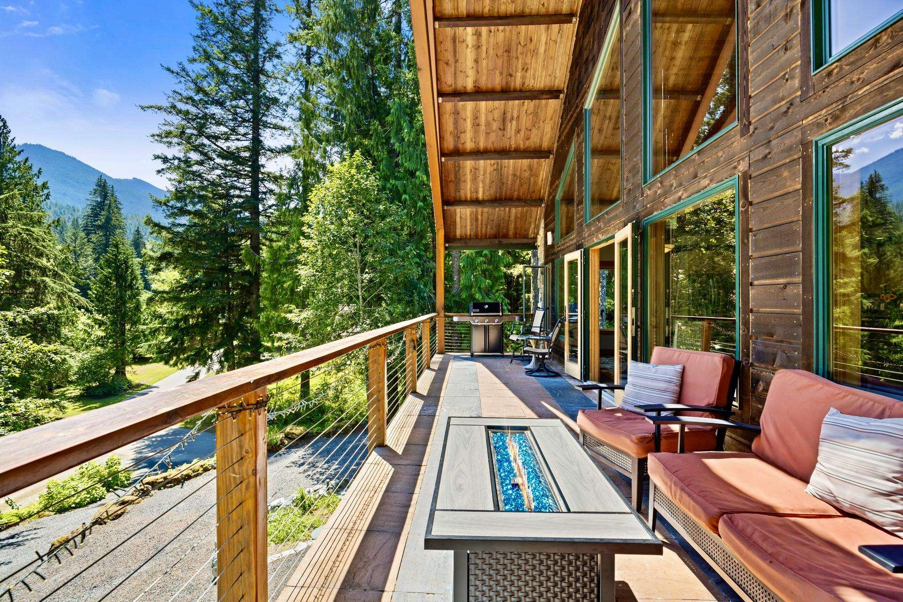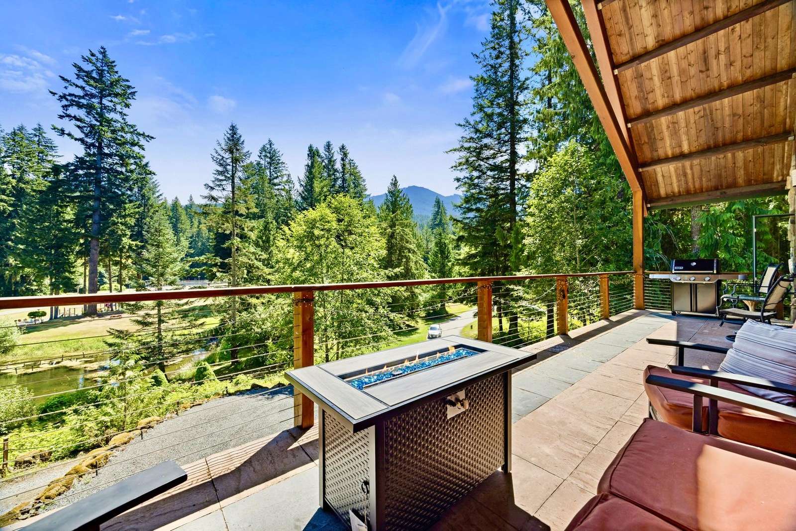 The cozy living room has a beautiful gas river rock fireplace where you can snuggle up with your favorite beverage for those chilly winter nights, and a bar with a mini fridge for cool refreshing drinks. Or step outside onto the covered deck and enjoy the ambiance of breathtaking mountain and pond views while you warm yourself by the gas fire table and relax in the comfy seating.