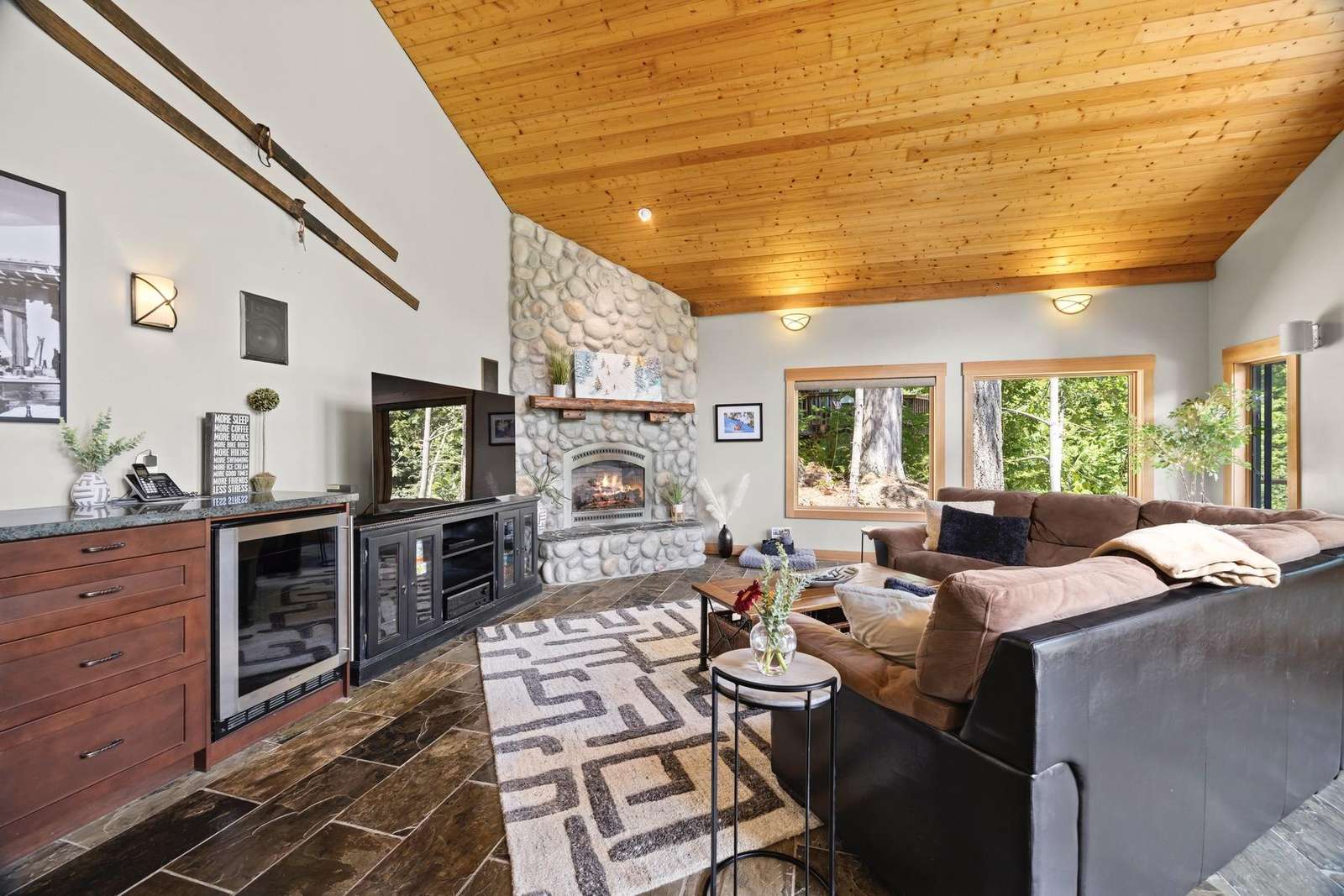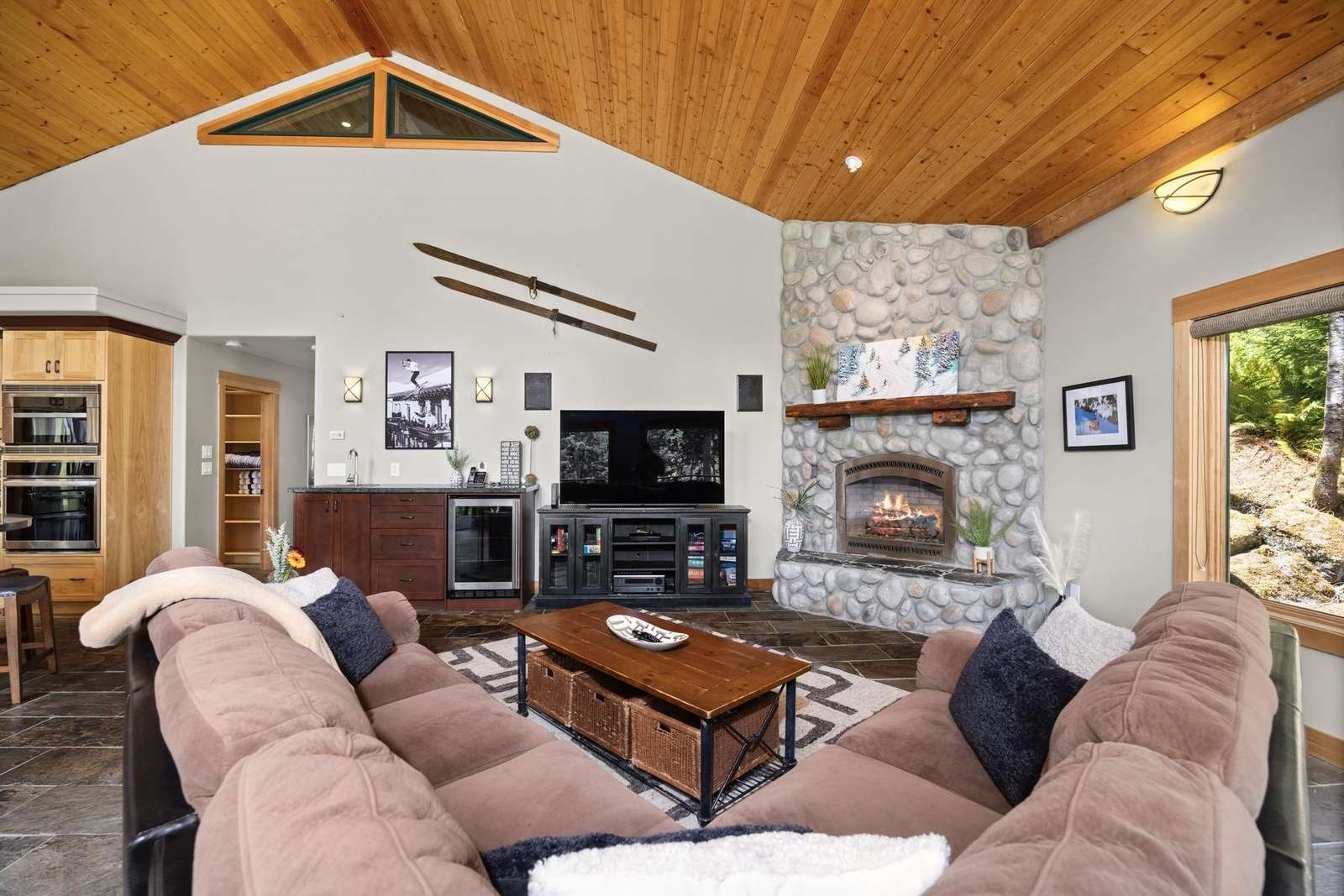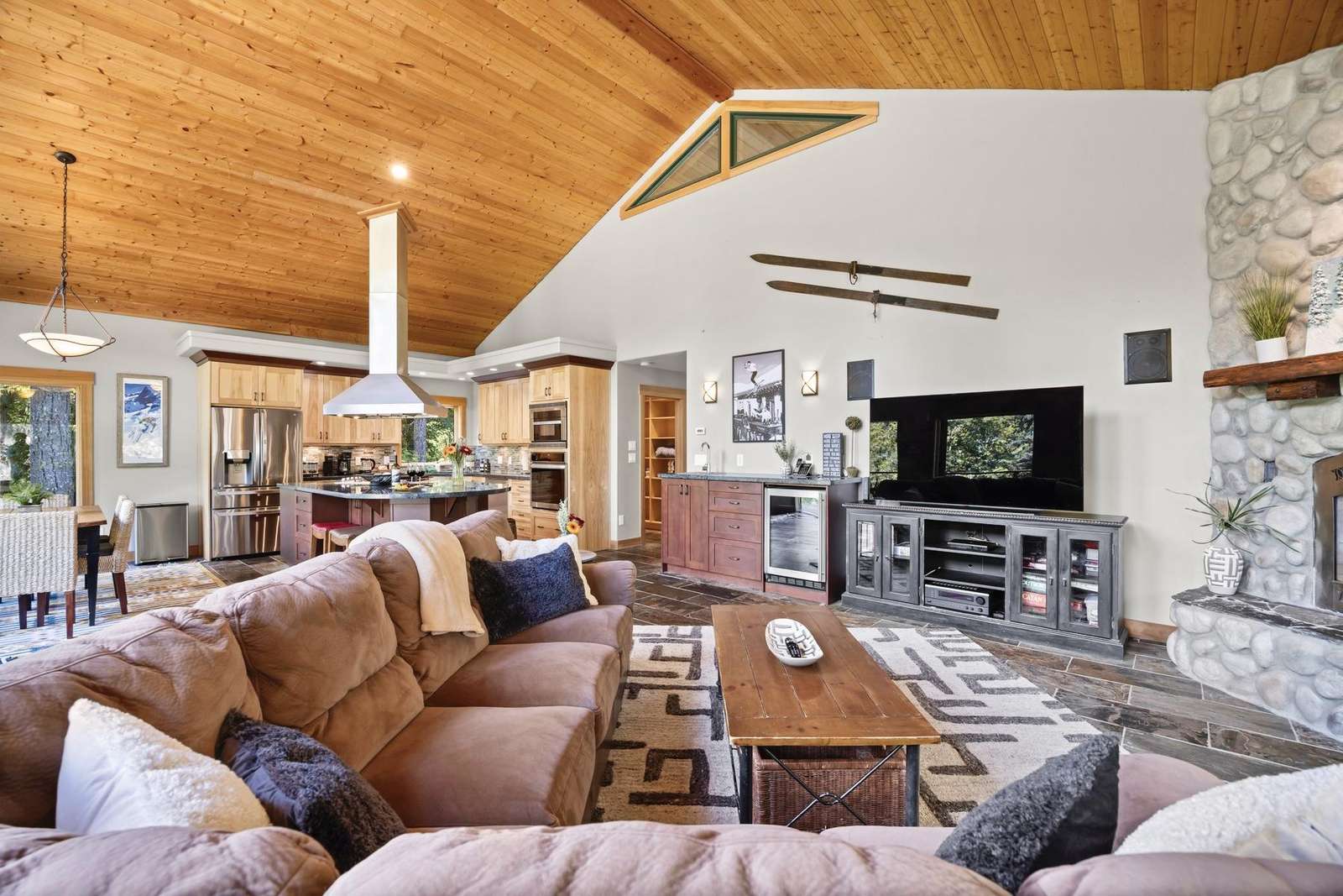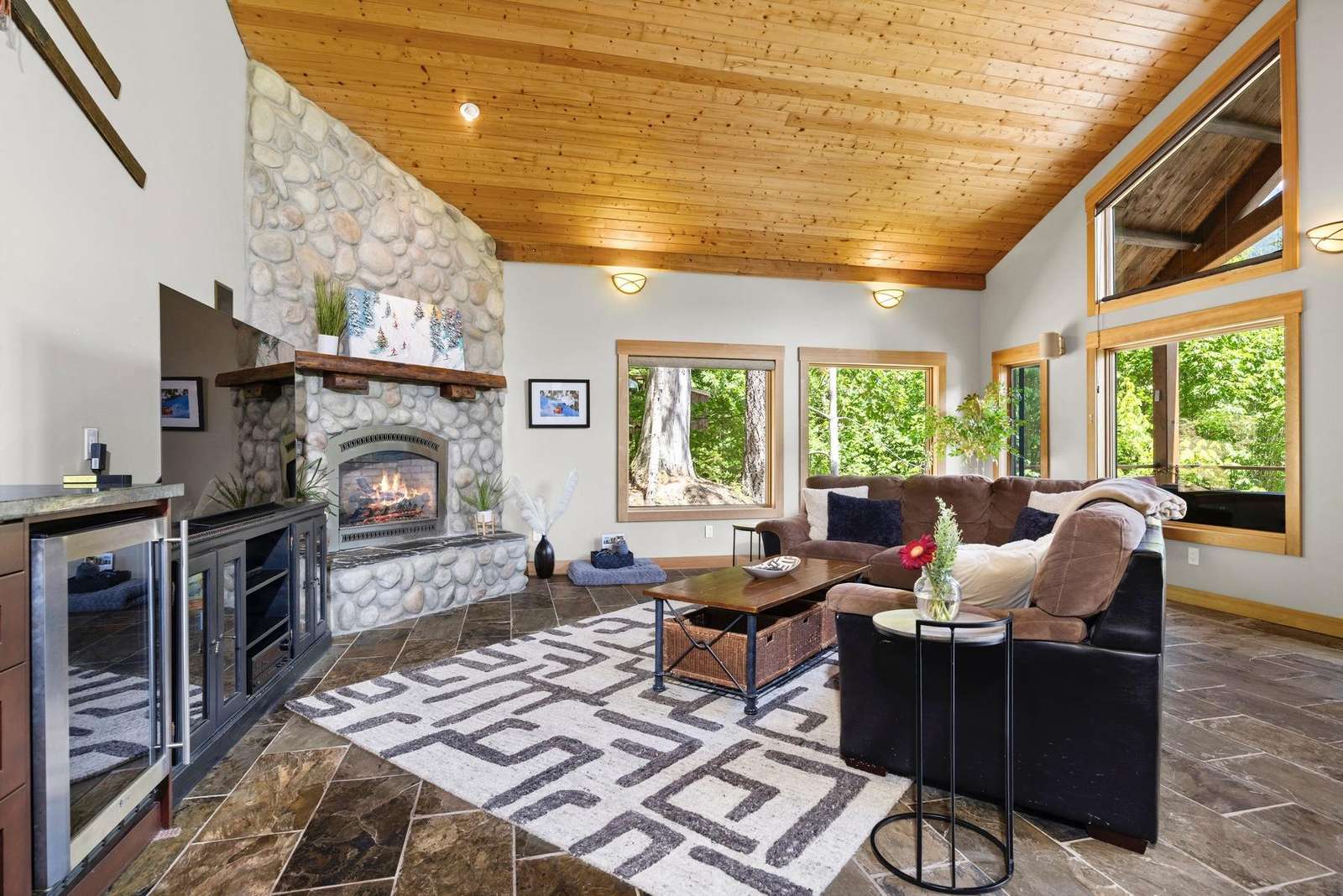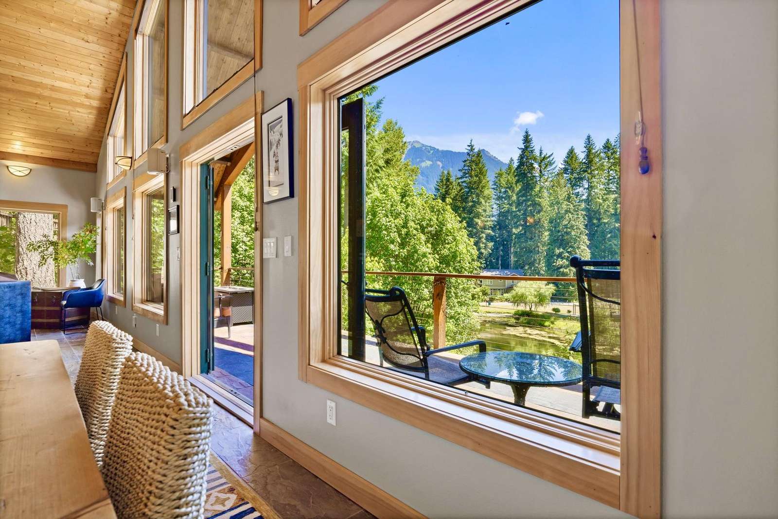 The cozy living room has a beautiful gas river rock fireplace where you can snuggle up with your favorite beverage for those chilly winter nights, and a bar with a mini fridge for cool refreshing drinks. Or step outside onto the covered deck and enjoy the ambiance of breathtaking mountain and pond views while you warm yourself by the gas fire table and relax in the comfy seating.