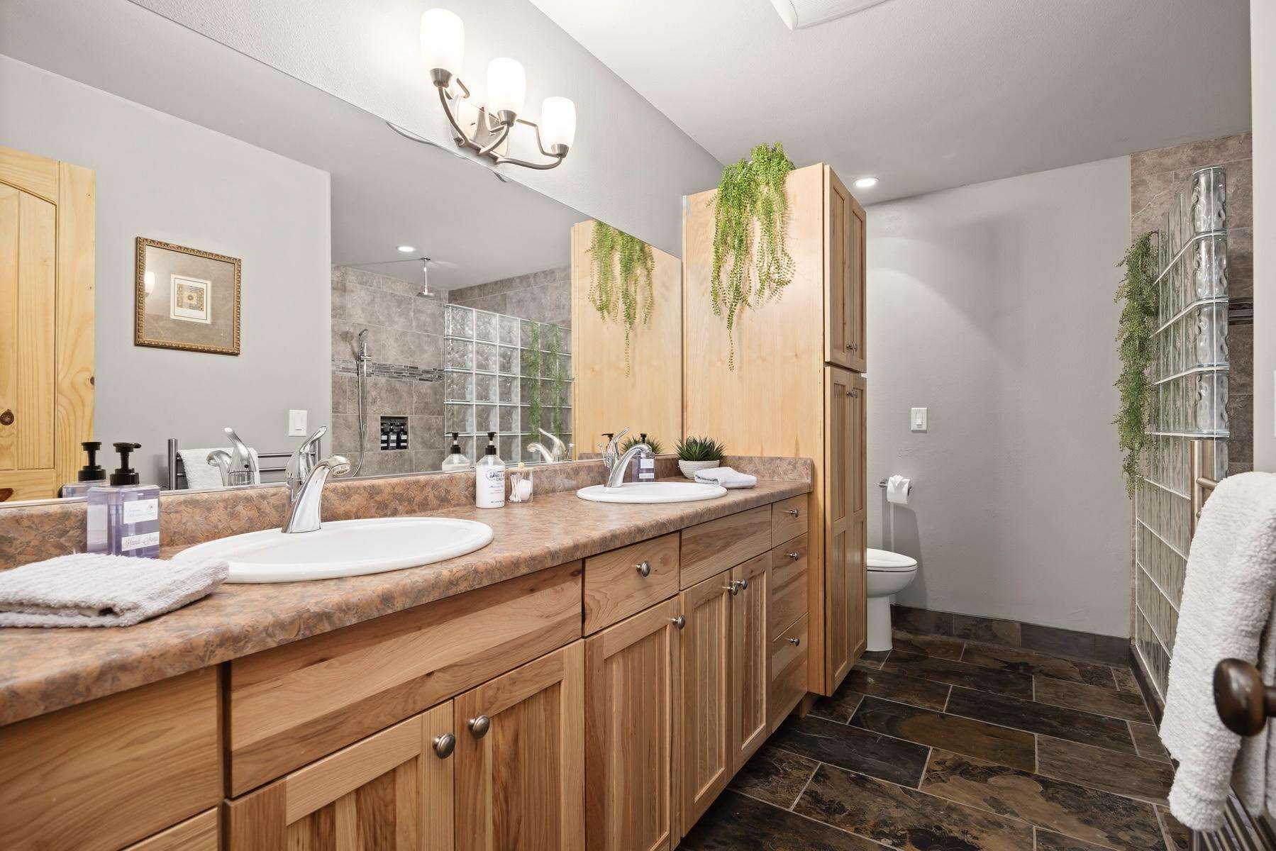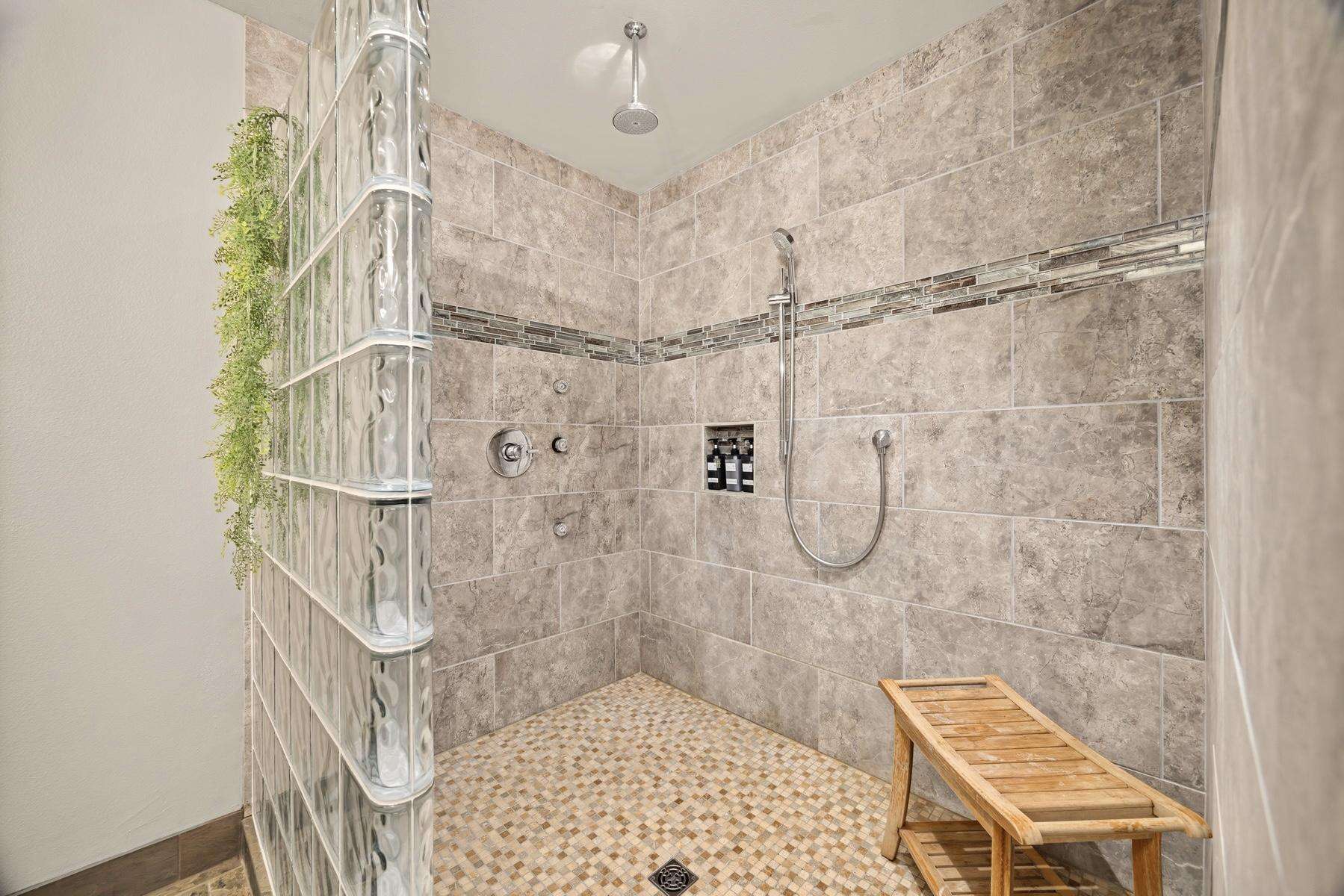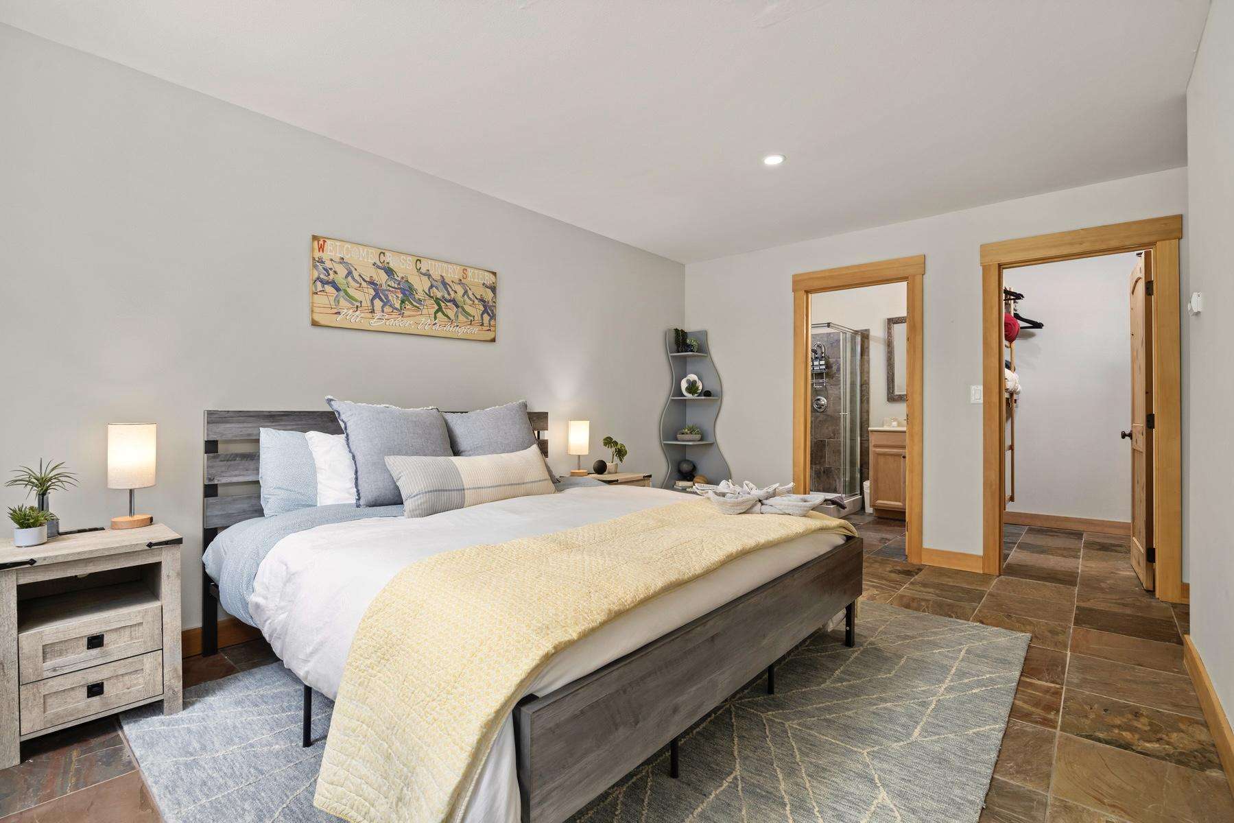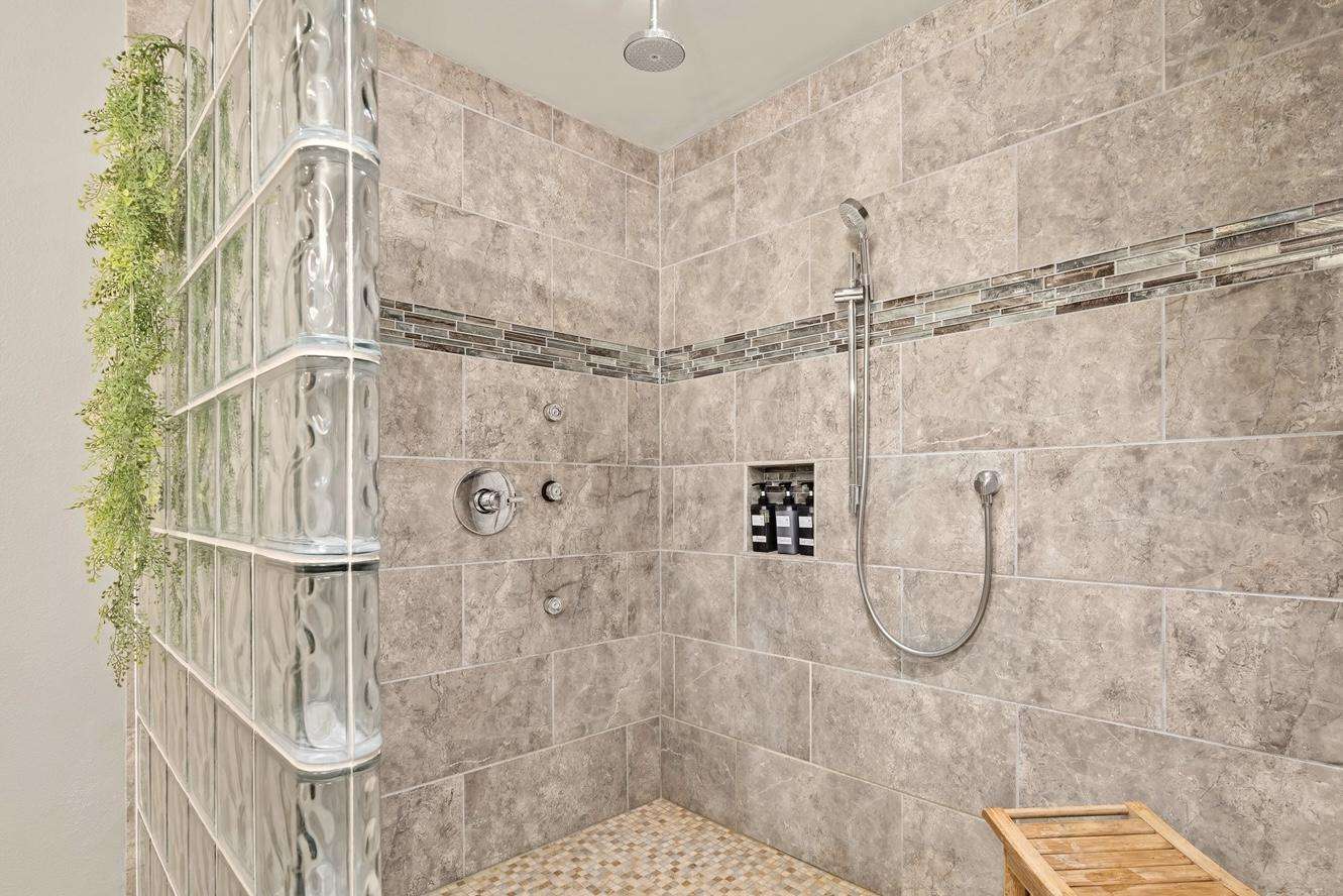 The master suite includes a private attached bath with a beautiful tiled walk-in shower, a double sink vanity, and a large walk-in closet. The king bed is adjustable with separate controllers so each side can find their own perfect comfort level for the ideal night’s sleep.