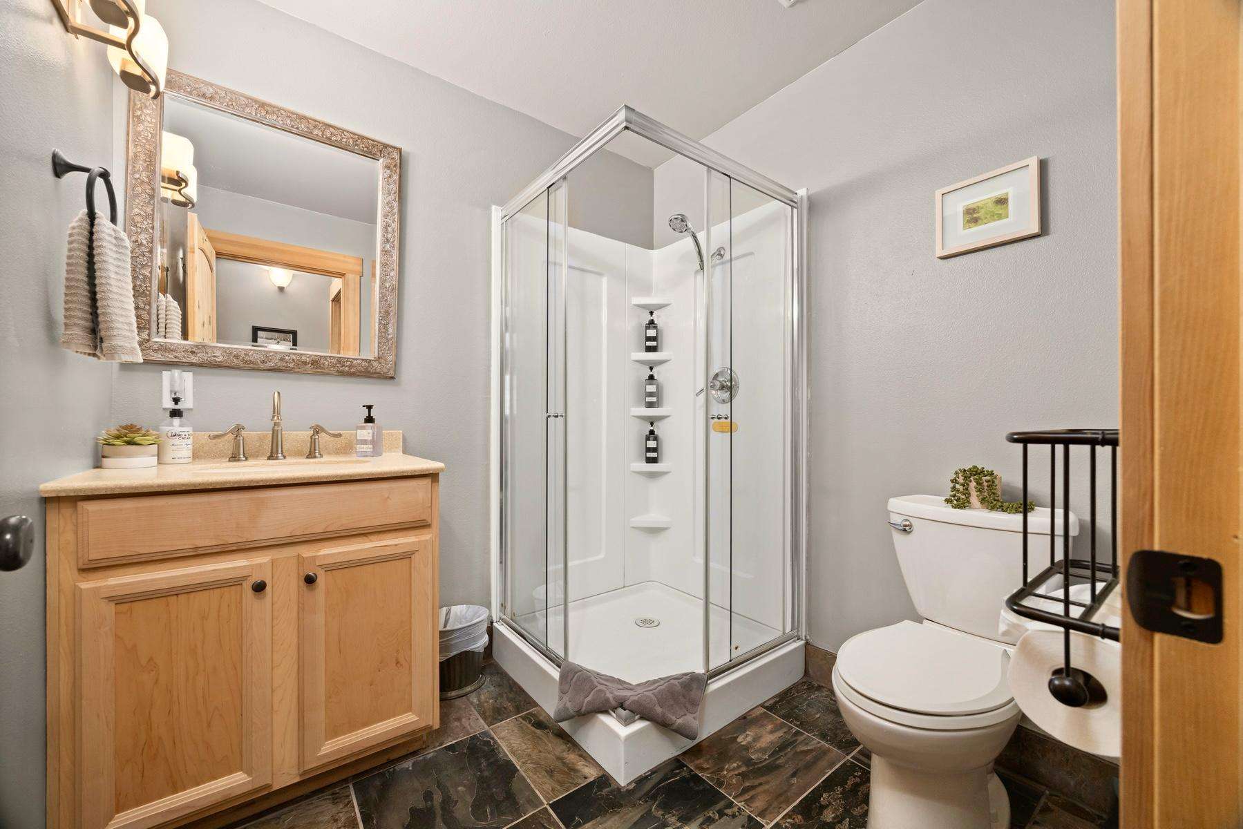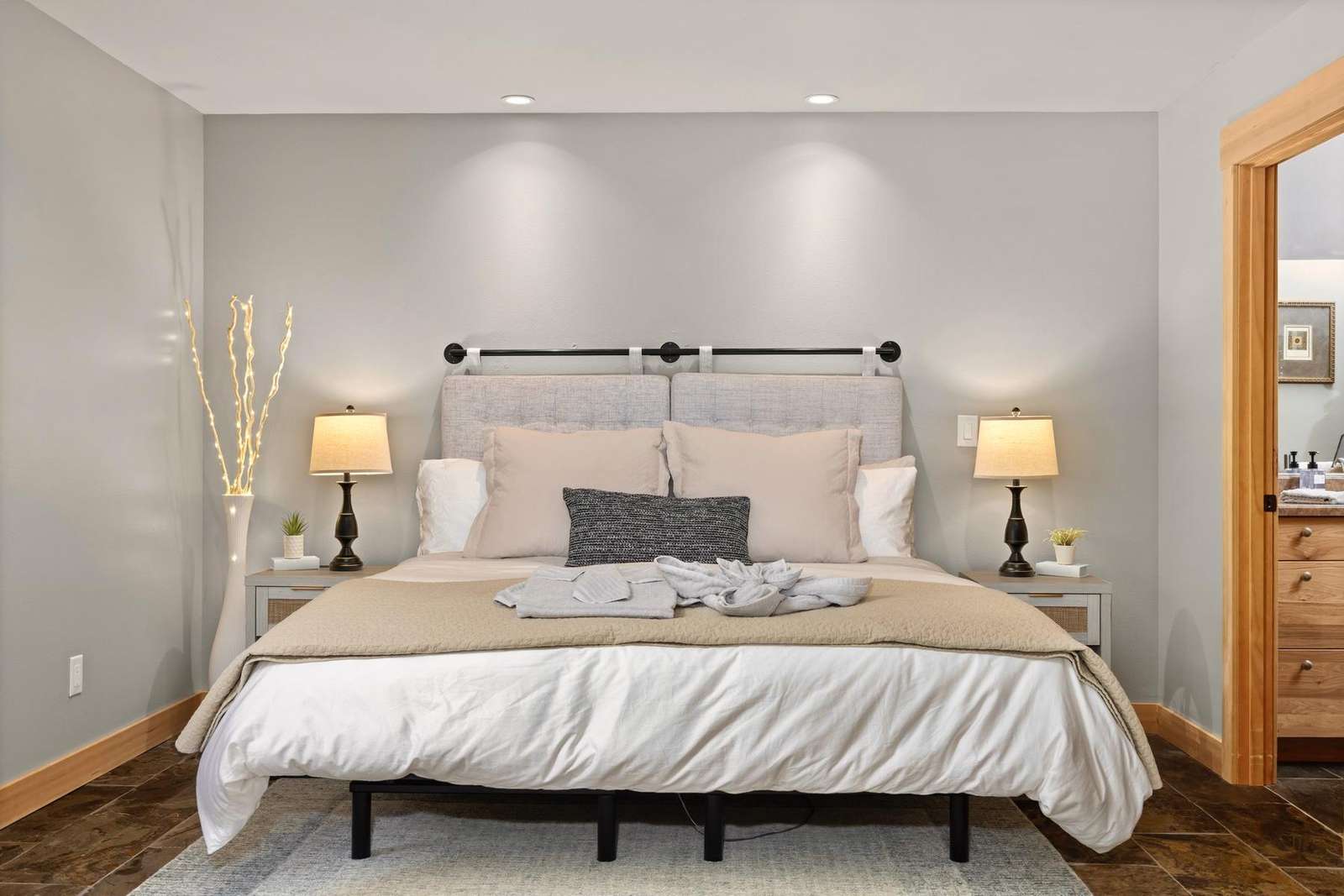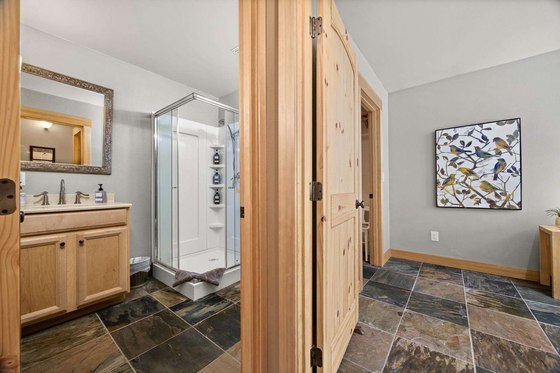 The master suite includes a private attached bath with a beautiful tiled walk-in shower, a double sink vanity, and a large walk-in closet. The king bed is adjustable with separate controllers so each side can find their own perfect comfort level for the ideal night’s sleep.