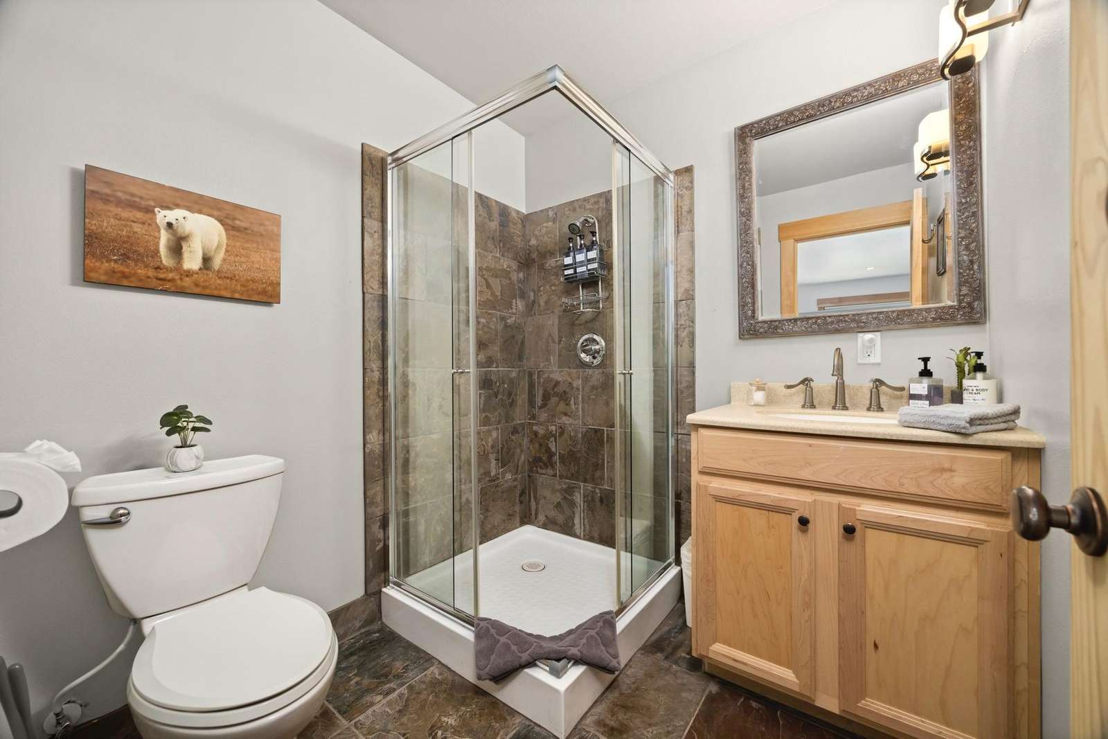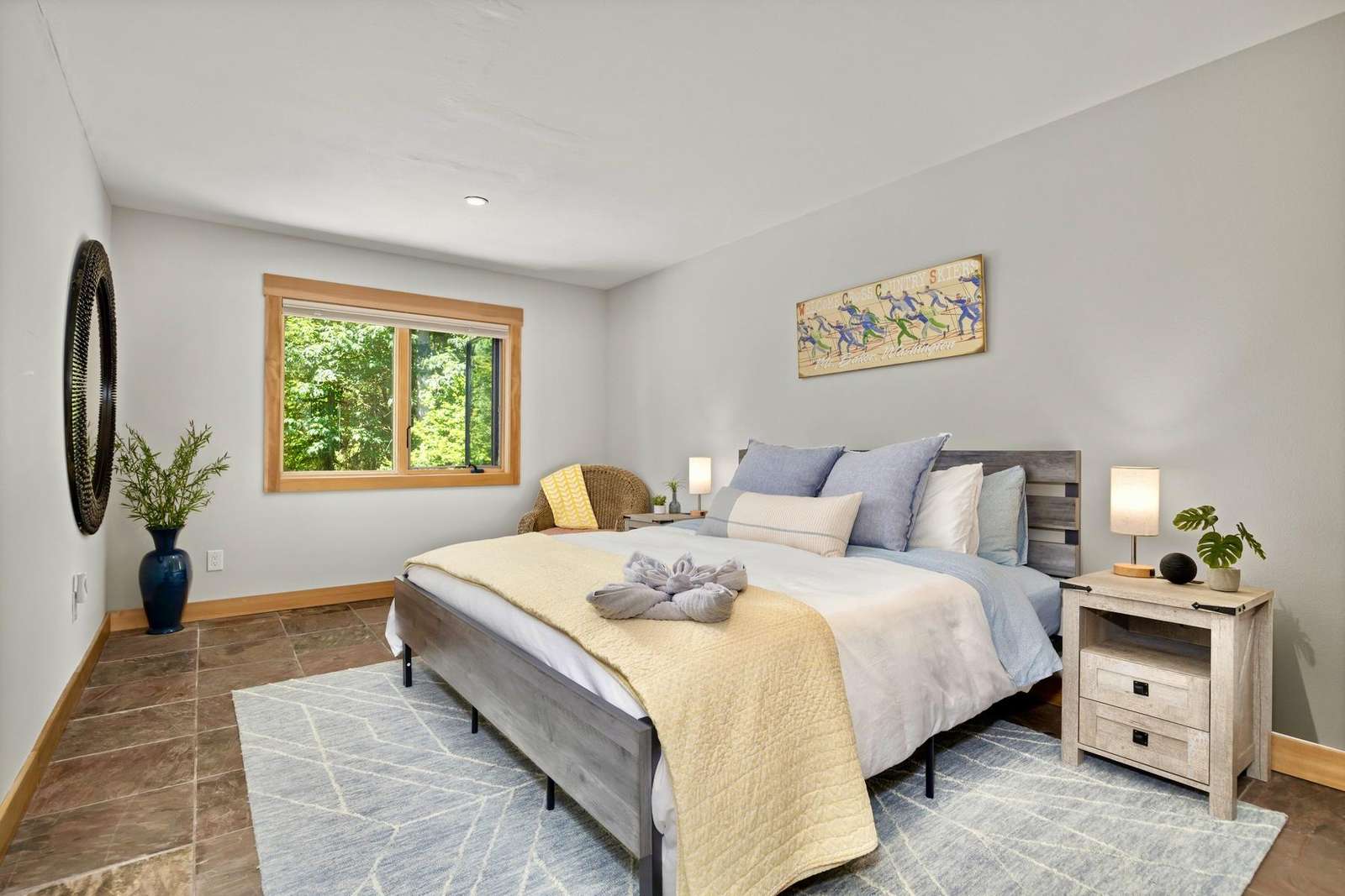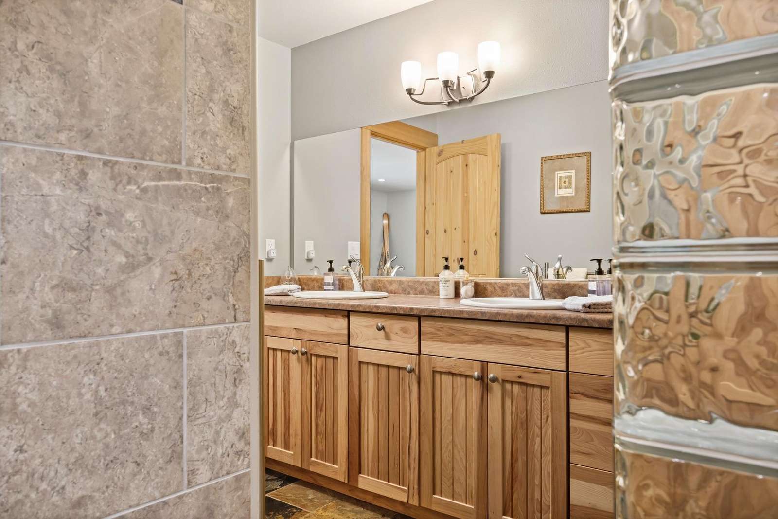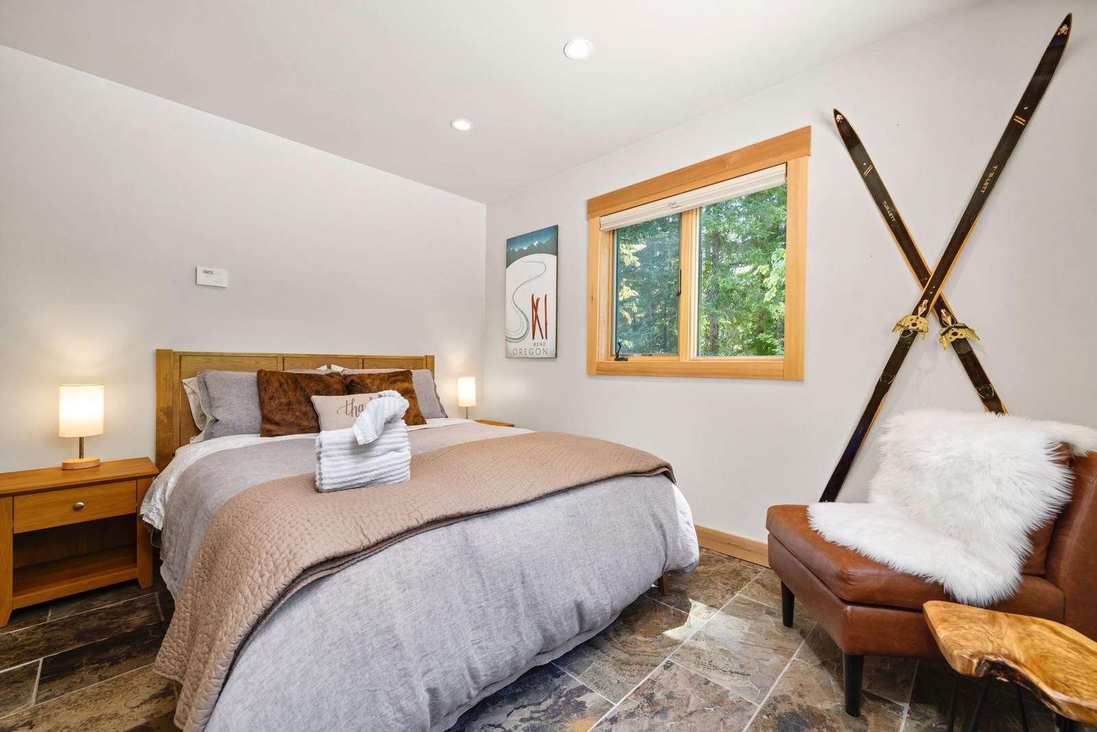 The master suite includes a private attached bath with a beautiful tiled walk-in shower, a double sink vanity, and a large walk-in closet. The king bed is adjustable with separate controllers so each side can find their own perfect comfort level for the ideal night’s sleep.