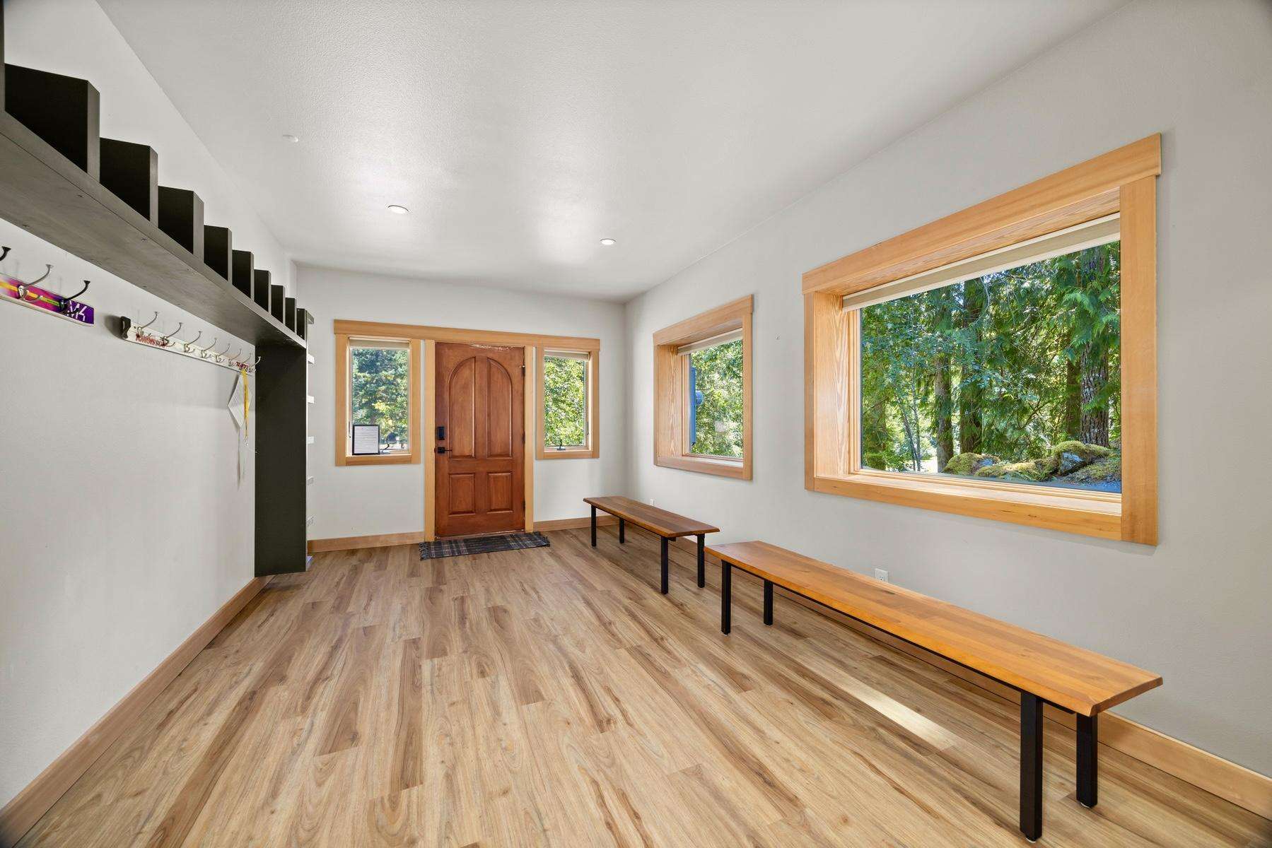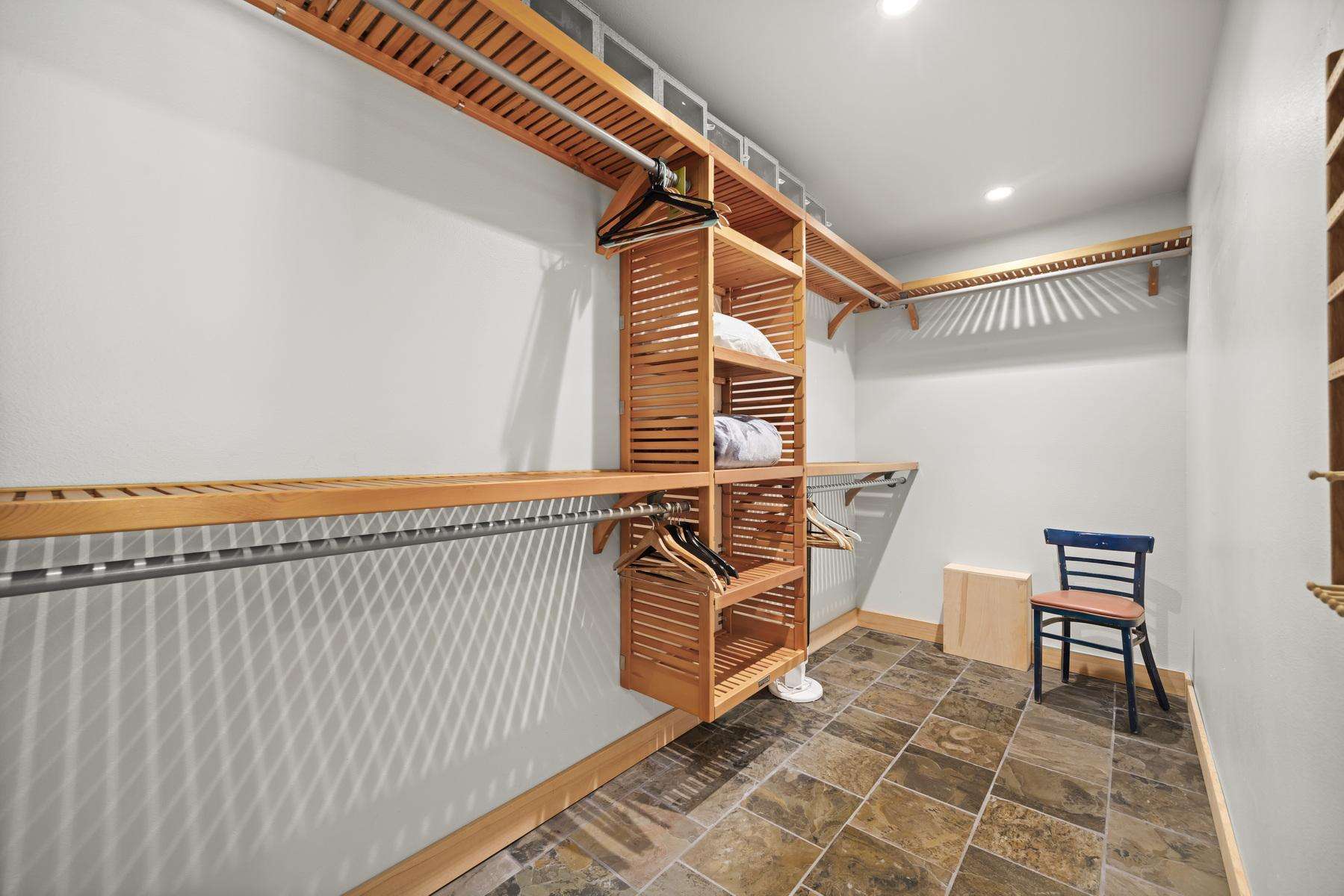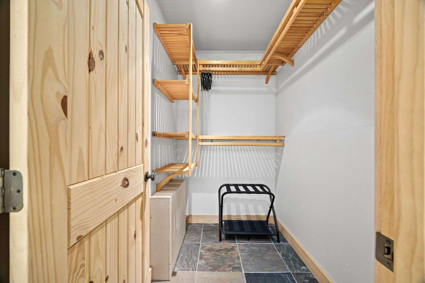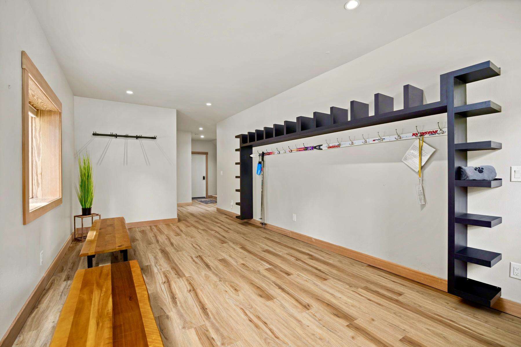 Pulling up to the front of the home there is a two-car garage you are welcome to use, and the main entrance. There is an exercise bike and a game table in the garage as well. The large mudroom has tons of space to hang your wet ski clothing or hiking gear, and plenty of shelving for your belongings. There are heated floors which extend throughout the entire house. You can park in the back of the home for ease of unloading without stairs.