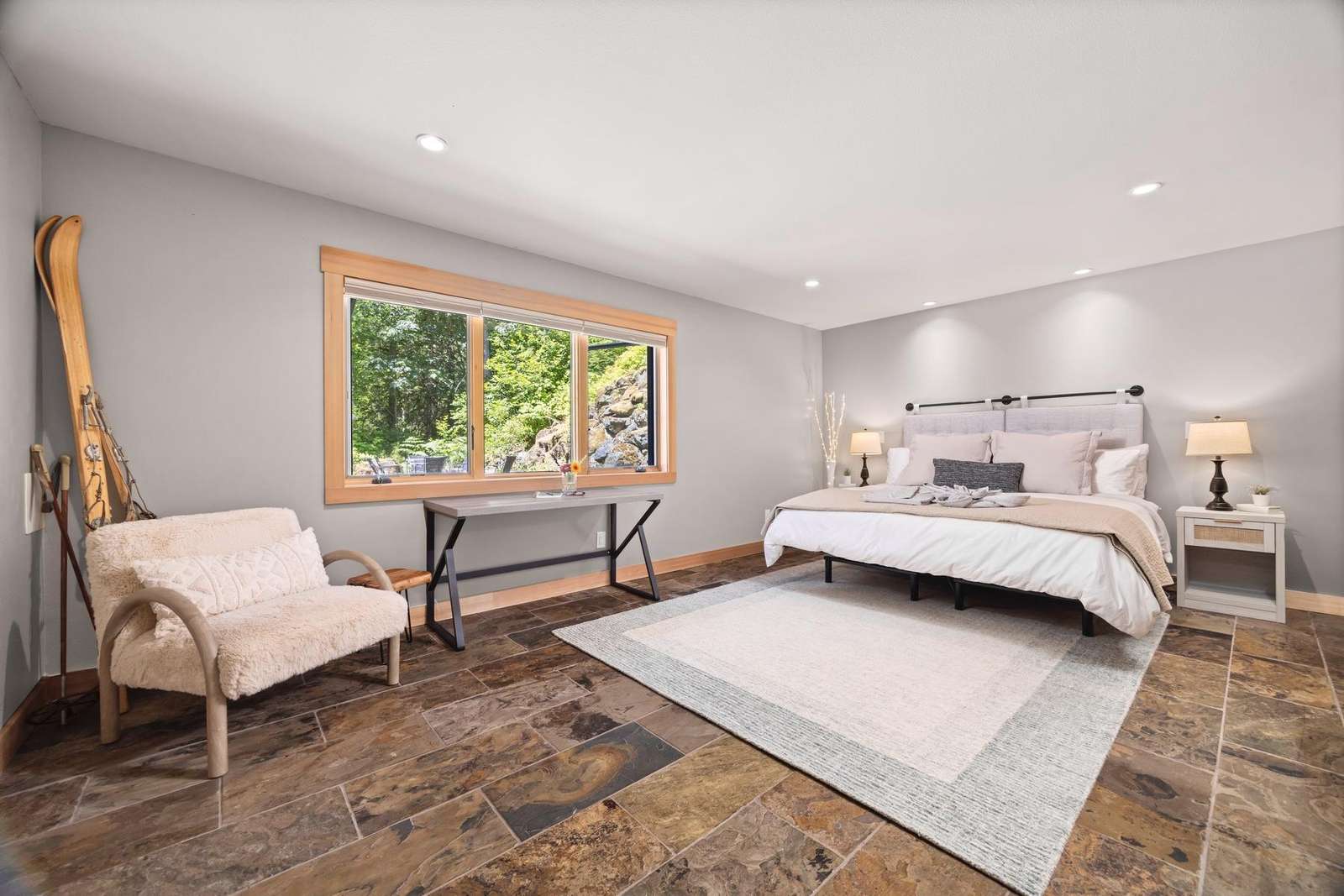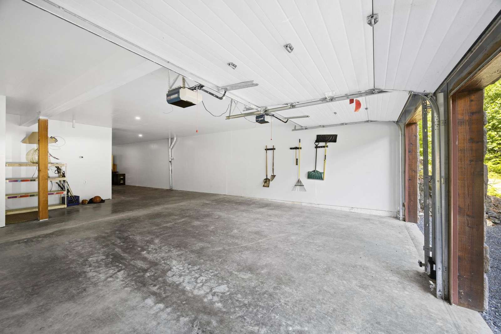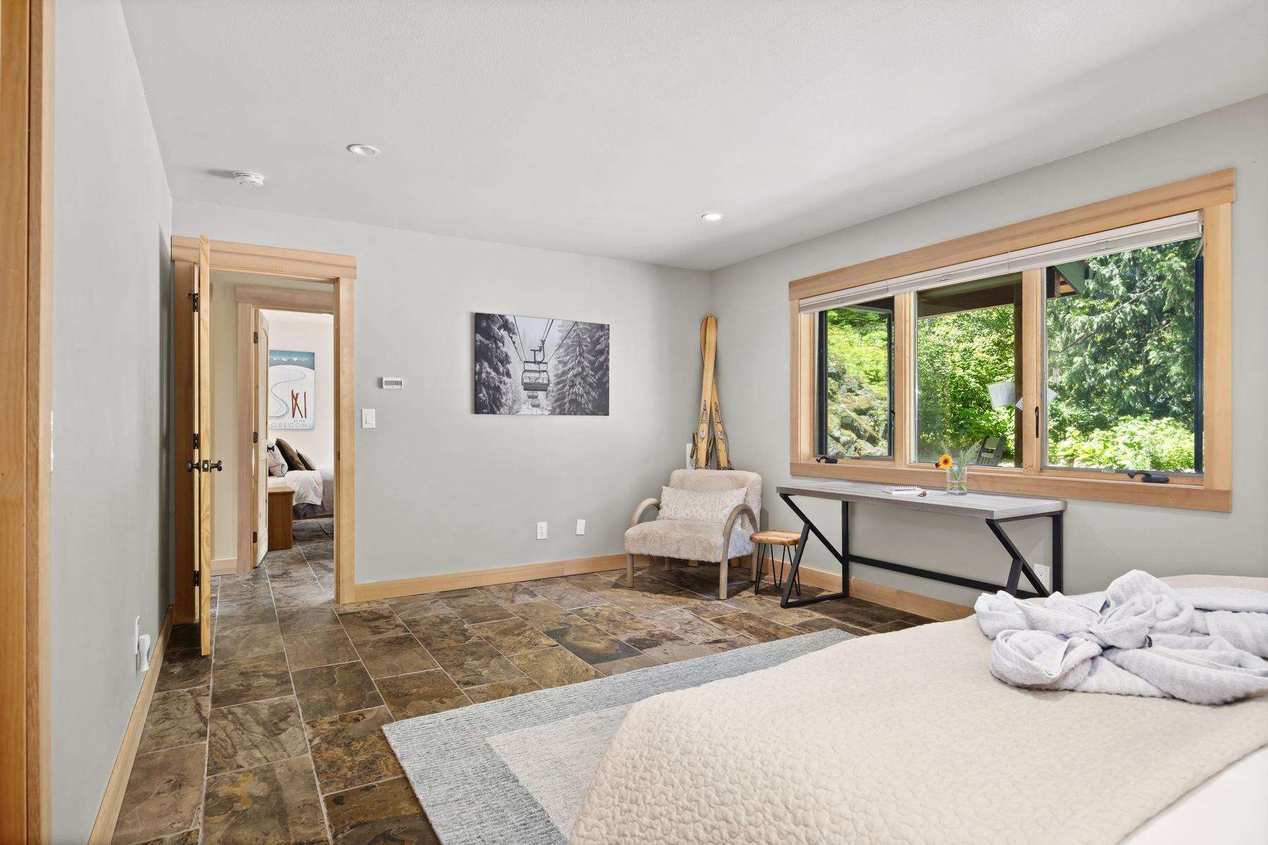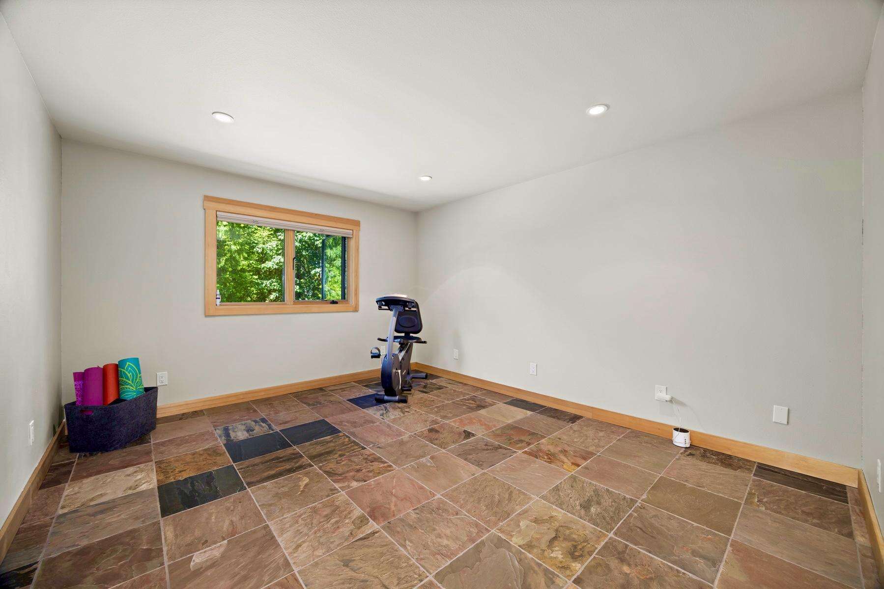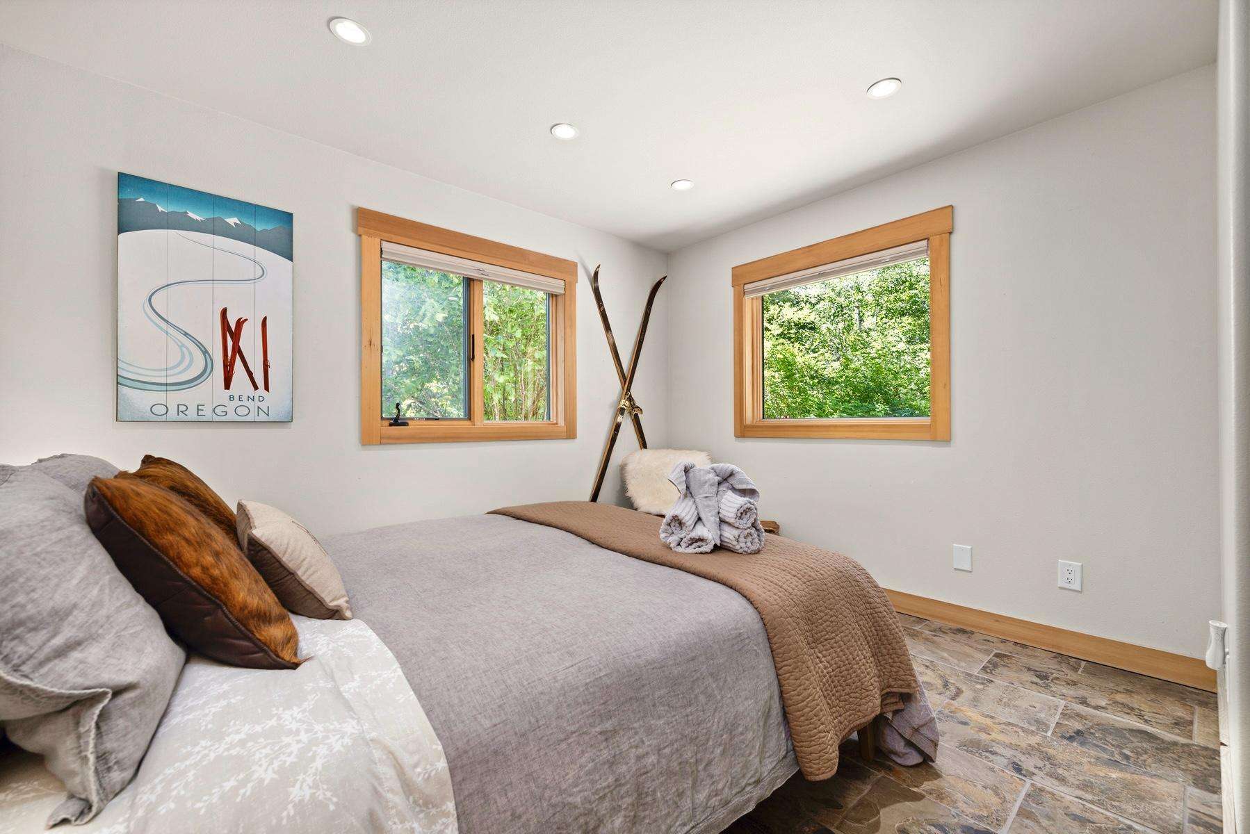 Pulling up to the front of the home there is a two-car garage you are welcome to use, and the main entrance. There is an exercise bike and a game table in the garage as well. The large mudroom has tons of space to hang your wet ski clothing or hiking gear, and plenty of shelving for your belongings. There are heated floors which extend throughout the entire house. You can park in the back of the home for ease of unloading without stairs.
