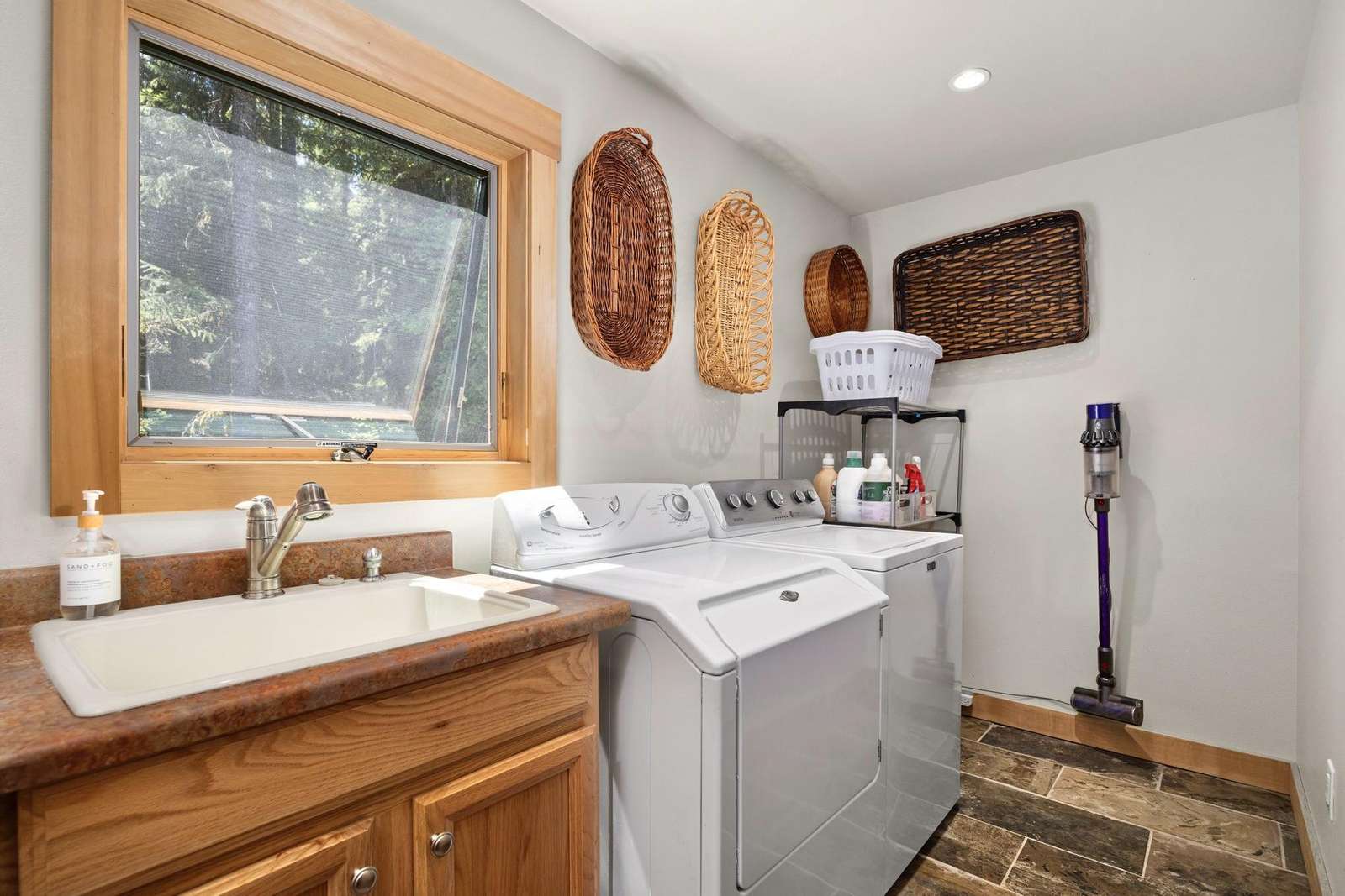 The main floor is rounded off with a spacious laundry room, a master suite, a second bedroom with a queen bed, and the main ¾ bath with a tiled shower.