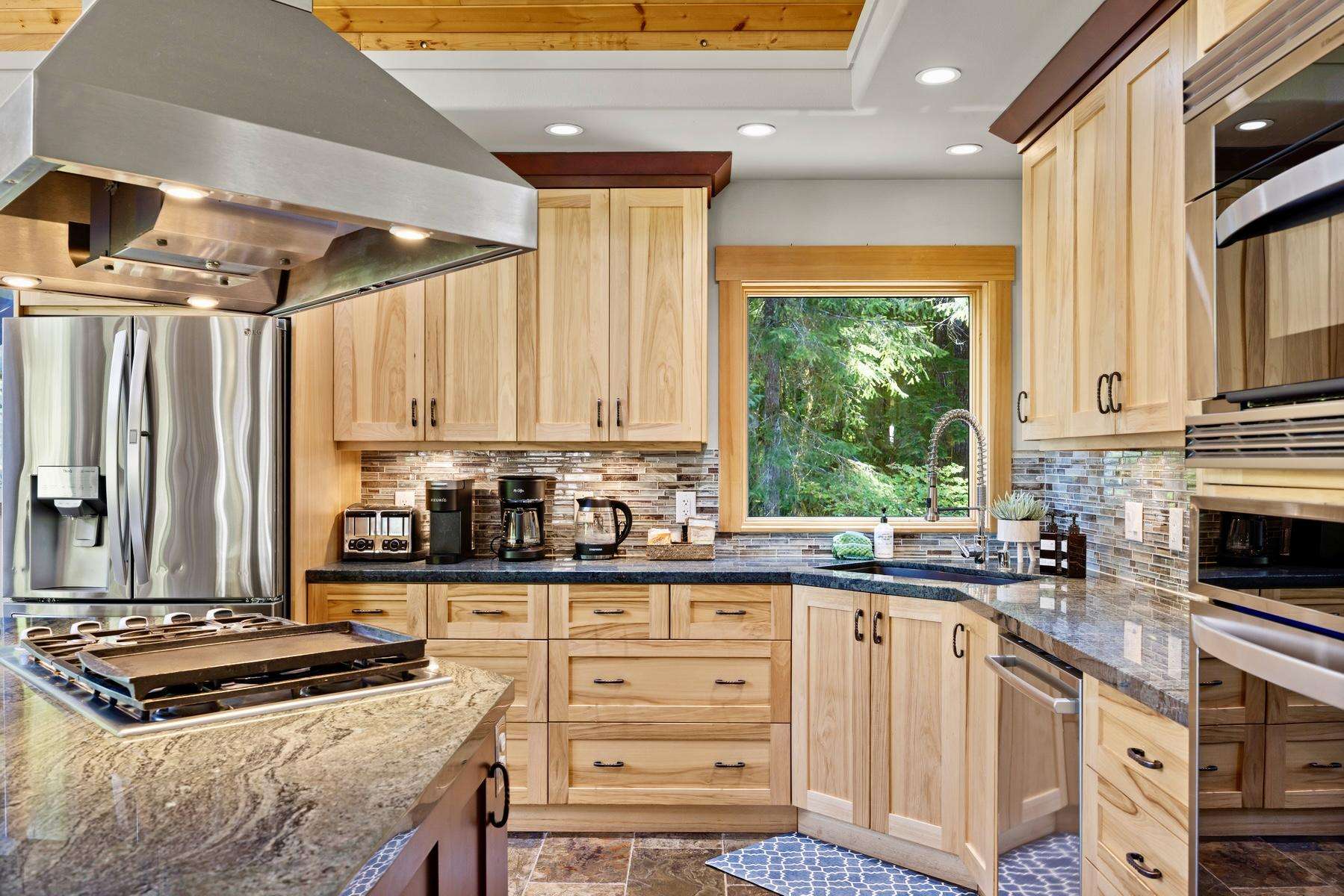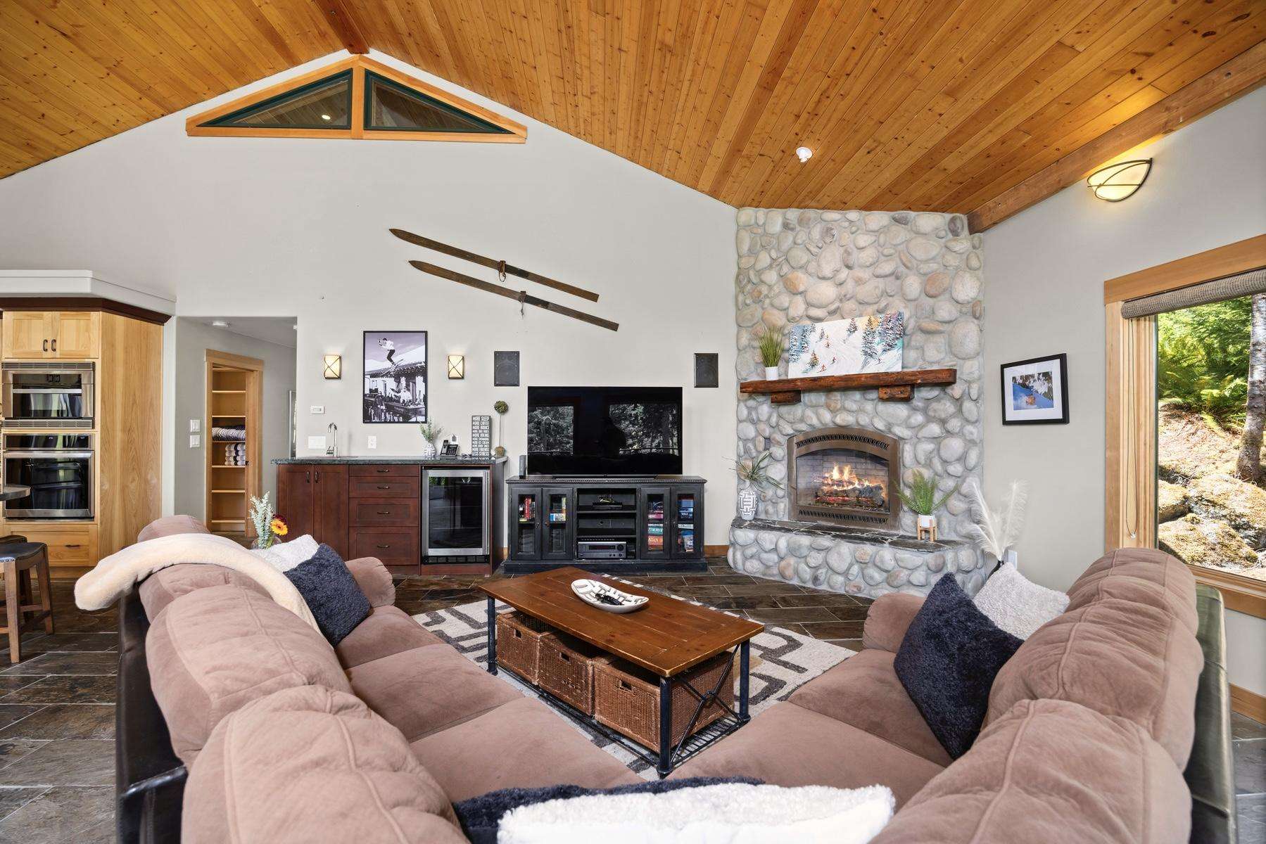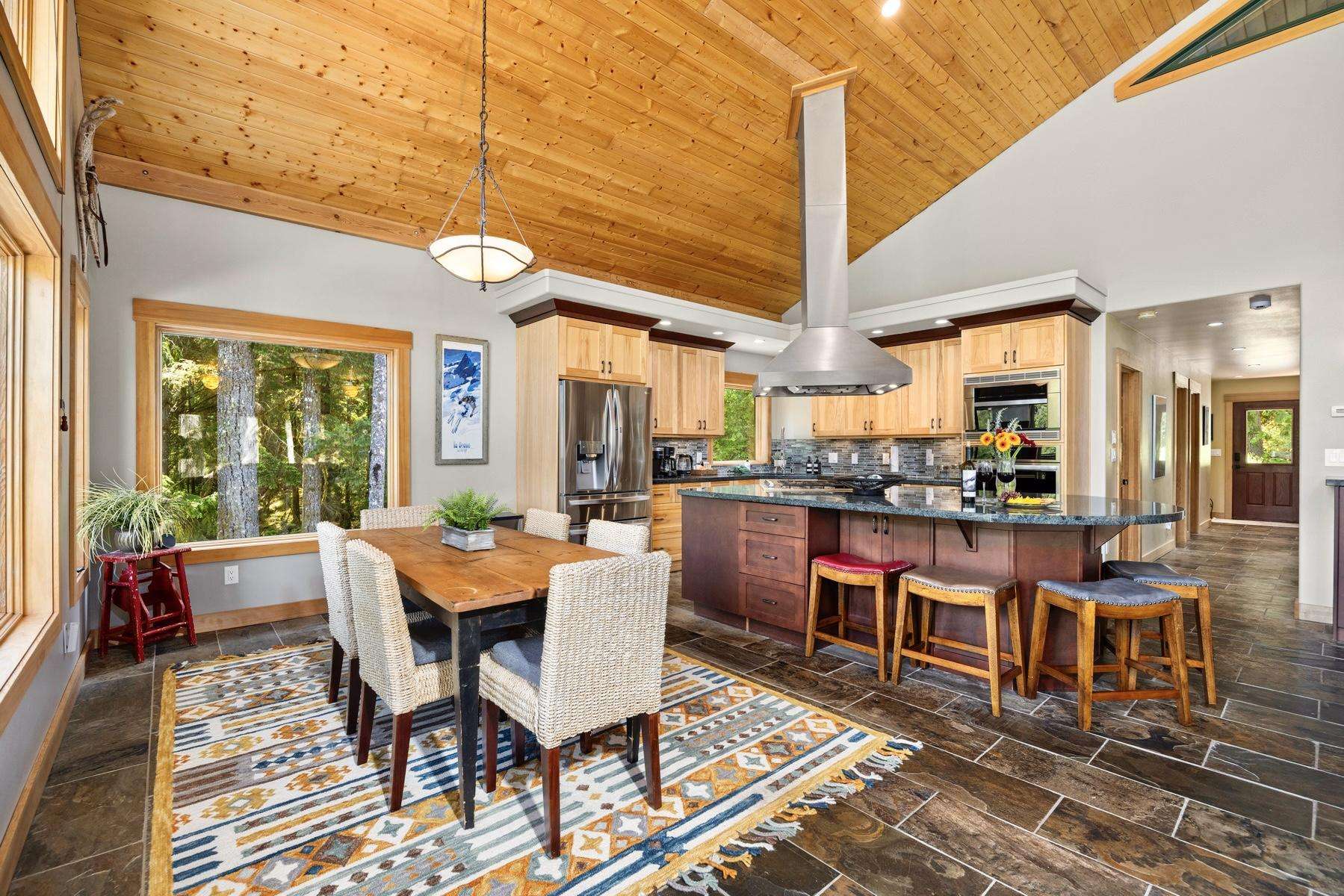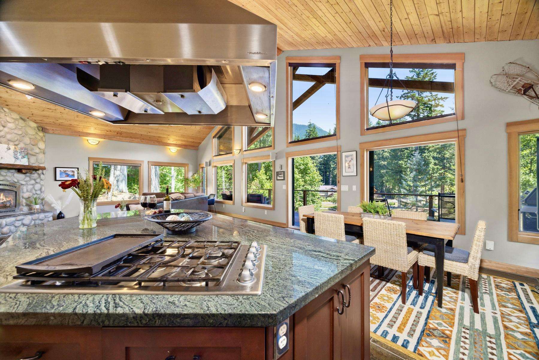 Heading up the 2nd floor there is a large open concept kitchen, dining, and living area with beautiful views of the Snowline Pond and Church Mountain. The well stocked kitchen has granite counter tops, solid wood cabinetry, a gas stove, and all the supplies you need to cook gourmet meals, there is also a propane BBQ on the balcony. We provide a detailed binder with local restaurants and other information in case you prefer to relax and let someone else take care of the meals.