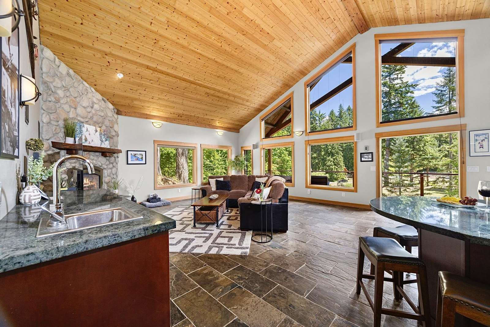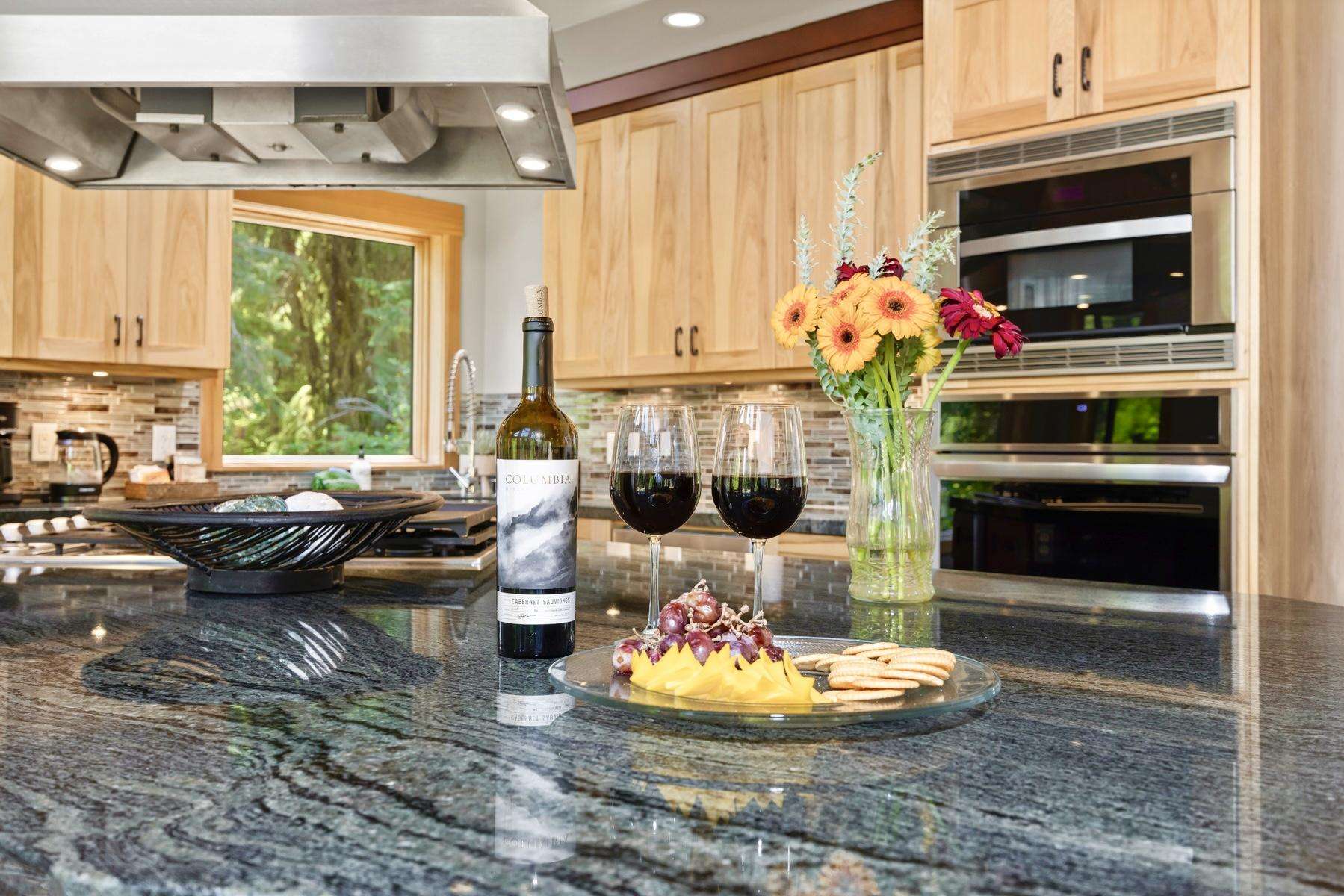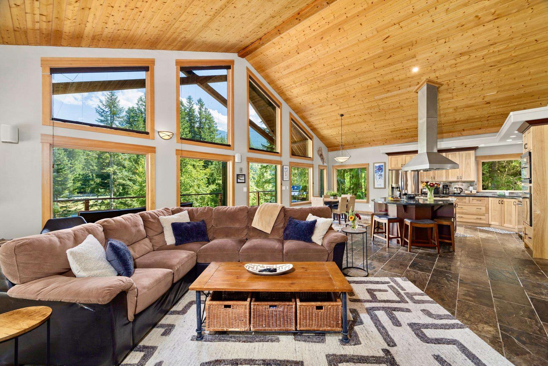 Heading up the 2nd floor there is a large open concept kitchen, dining, and living area with beautiful views of the Snowline Pond and Church Mountain. The well stocked kitchen has granite counter tops, solid wood cabinetry, a gas stove, and all the supplies you need to cook gourmet meals, there is also a propane BBQ on the balcony. We provide a detailed binder with local restaurants and other information in case you prefer to relax and let someone else take care of the meals.