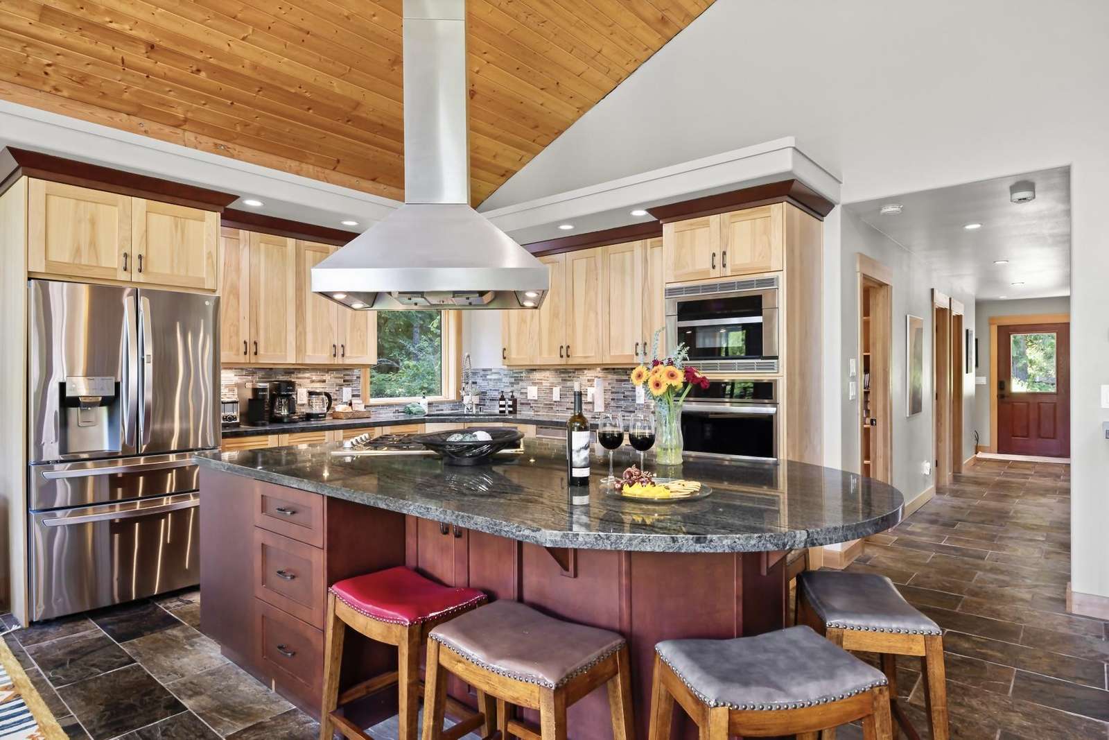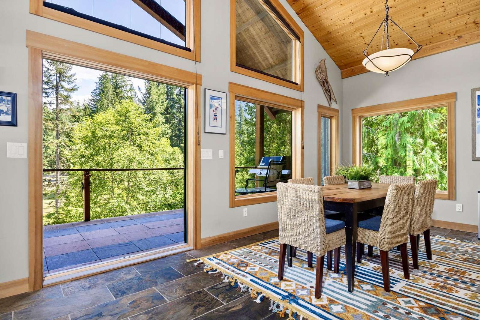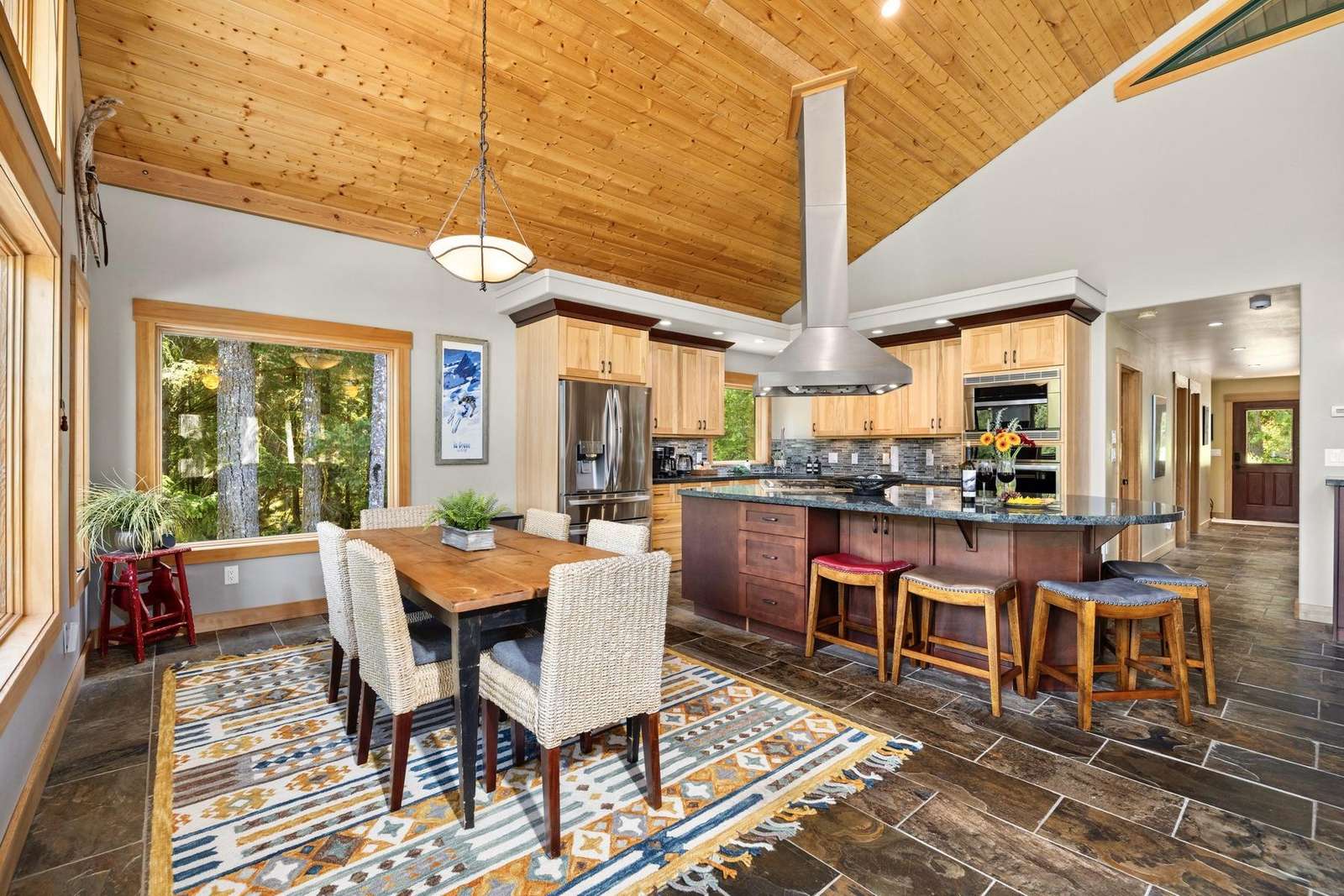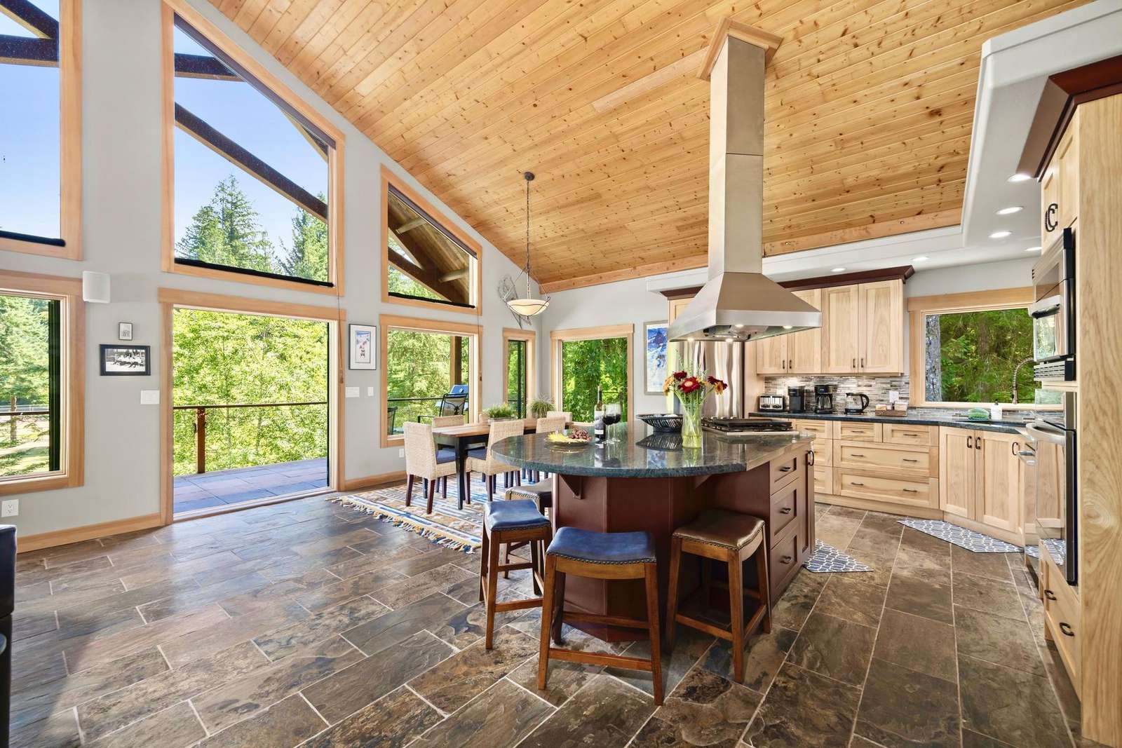 Heading up the 2nd floor there is a large open concept kitchen, dining, and living area with beautiful views of the Snowline Pond and Church Mountain. The well stocked kitchen has granite counter tops, solid wood cabinetry, a gas stove, and all the supplies you need to cook gourmet meals, there is also a propane BBQ on the balcony. We provide a detailed binder with local restaurants and other information in case you prefer to relax and let someone else take care of the meals.