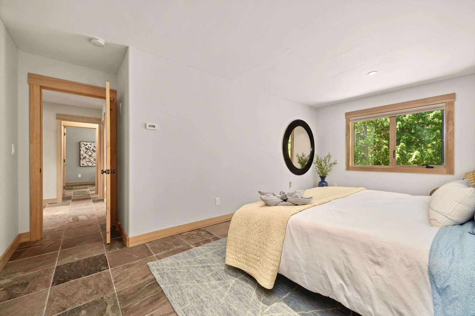 Upstairs on the 3rd floor there is a second master suit on your right with a king bed, and an attached bath with a tile shower, and a walk-in closet. In the middle room there is a trundle bed with two twin beds, a large tv, and a basket with some yoga mats and weights. To the left is the 4th bathroom with a shower, and the 5th bedroom which also has a king bed and walk-in closet.